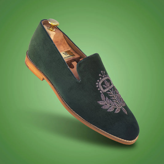 Forest Green Velvet Zardozi Wedding Ethic Shoes for Men