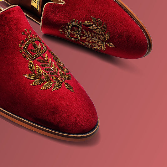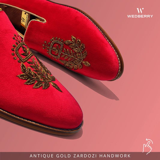 Red Velvet Zardozi Handwork Wedding Ethnic Shoes Loafer for Men