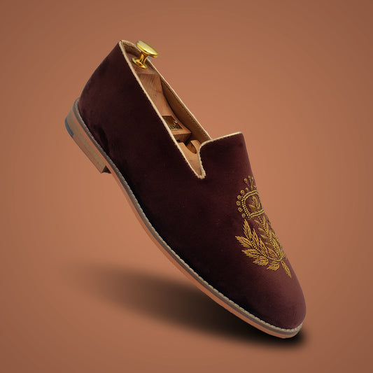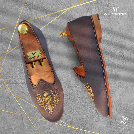 Brown Satin Silk with Golden Zardozi Handwork Loafers for Men