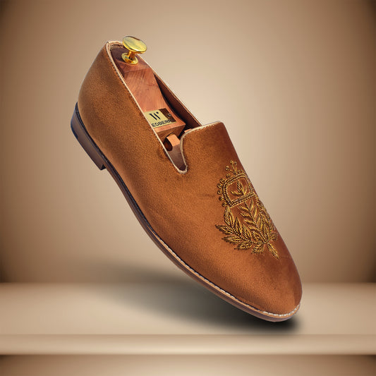 Tan Velvet Zardozi Wedding Ethnic Party Shoes Loafer for Men