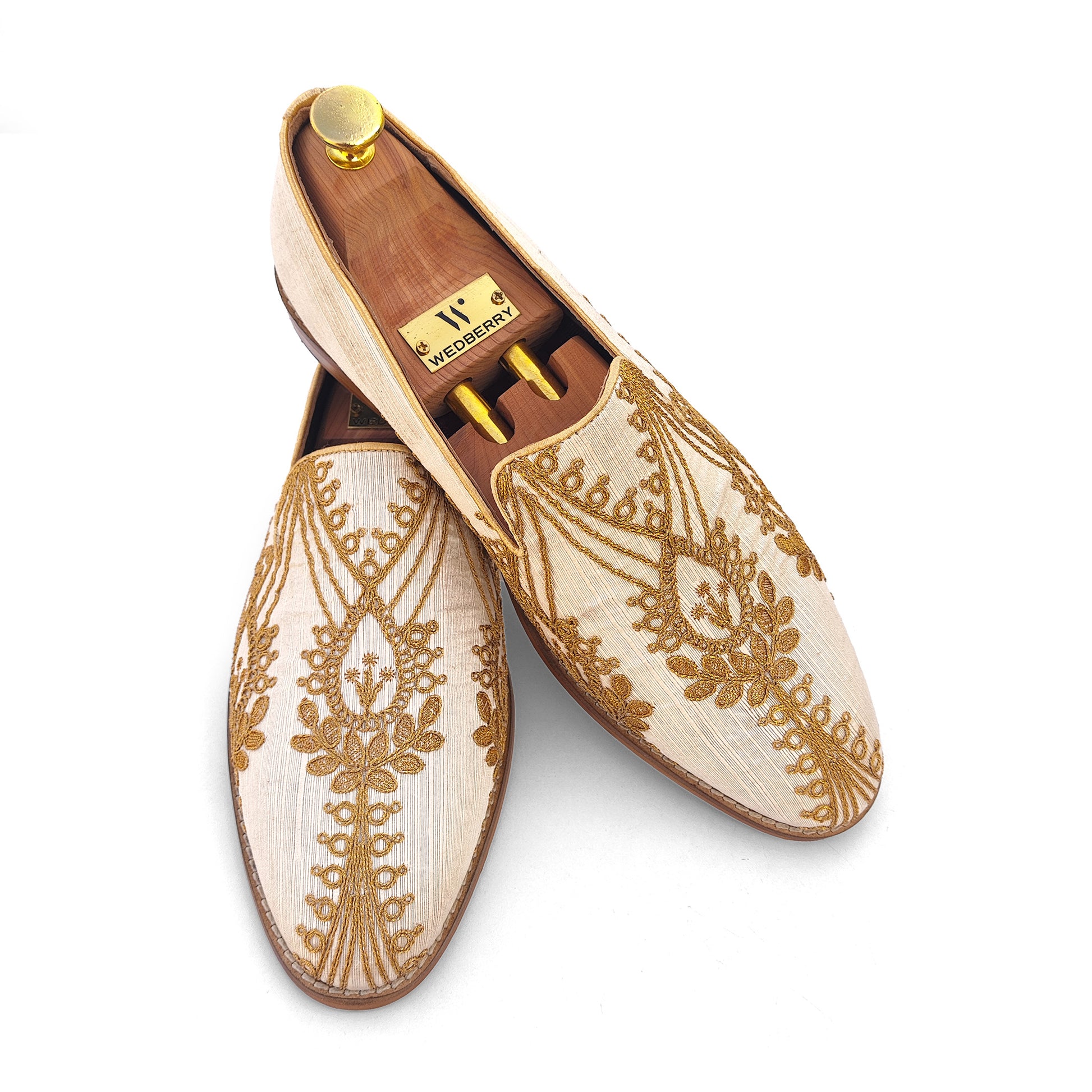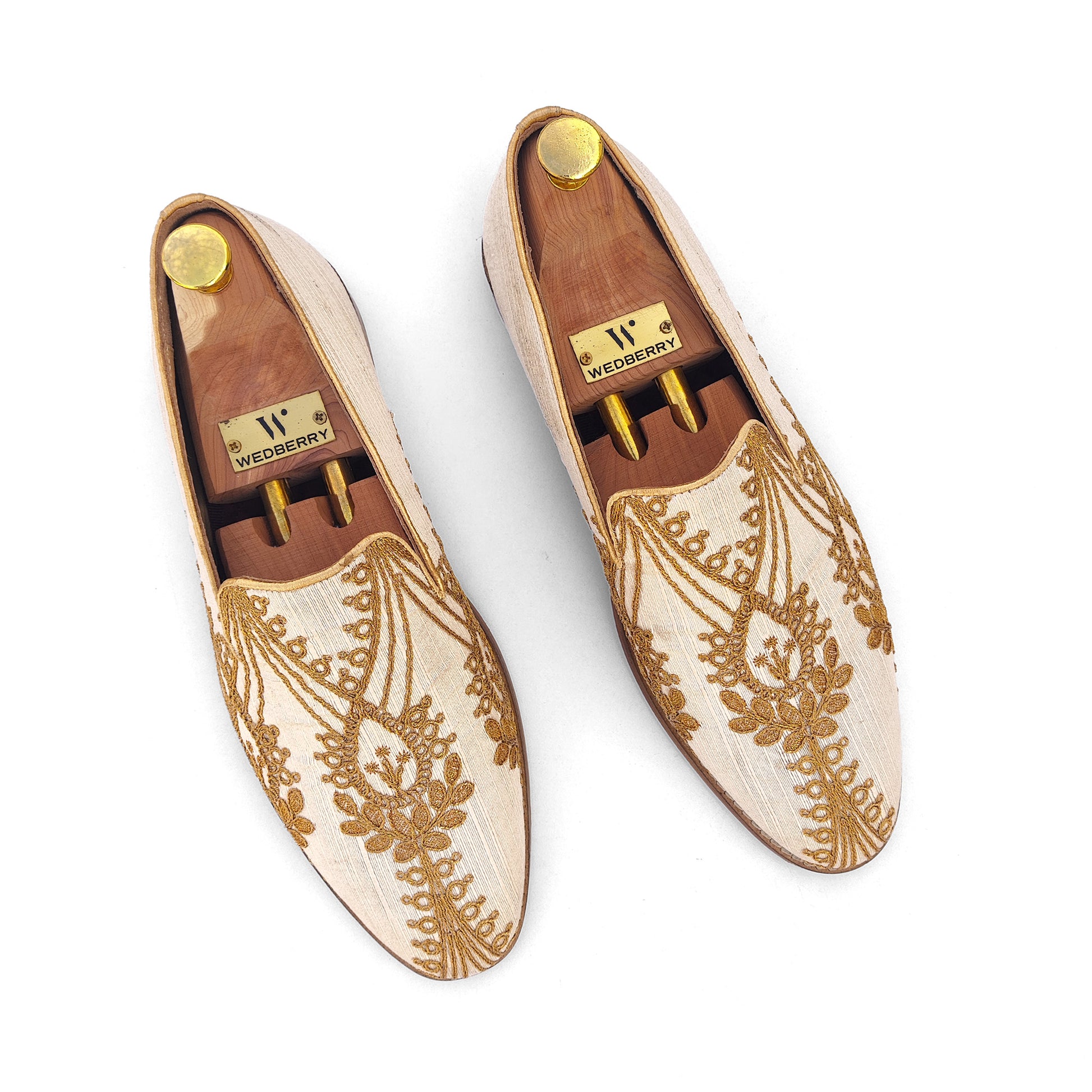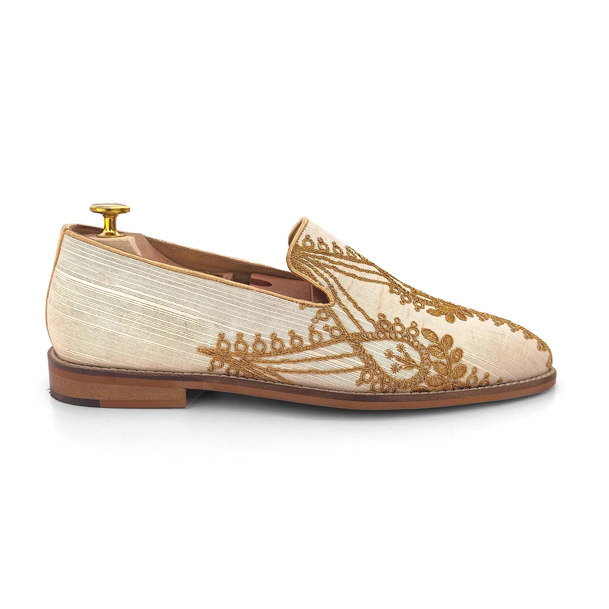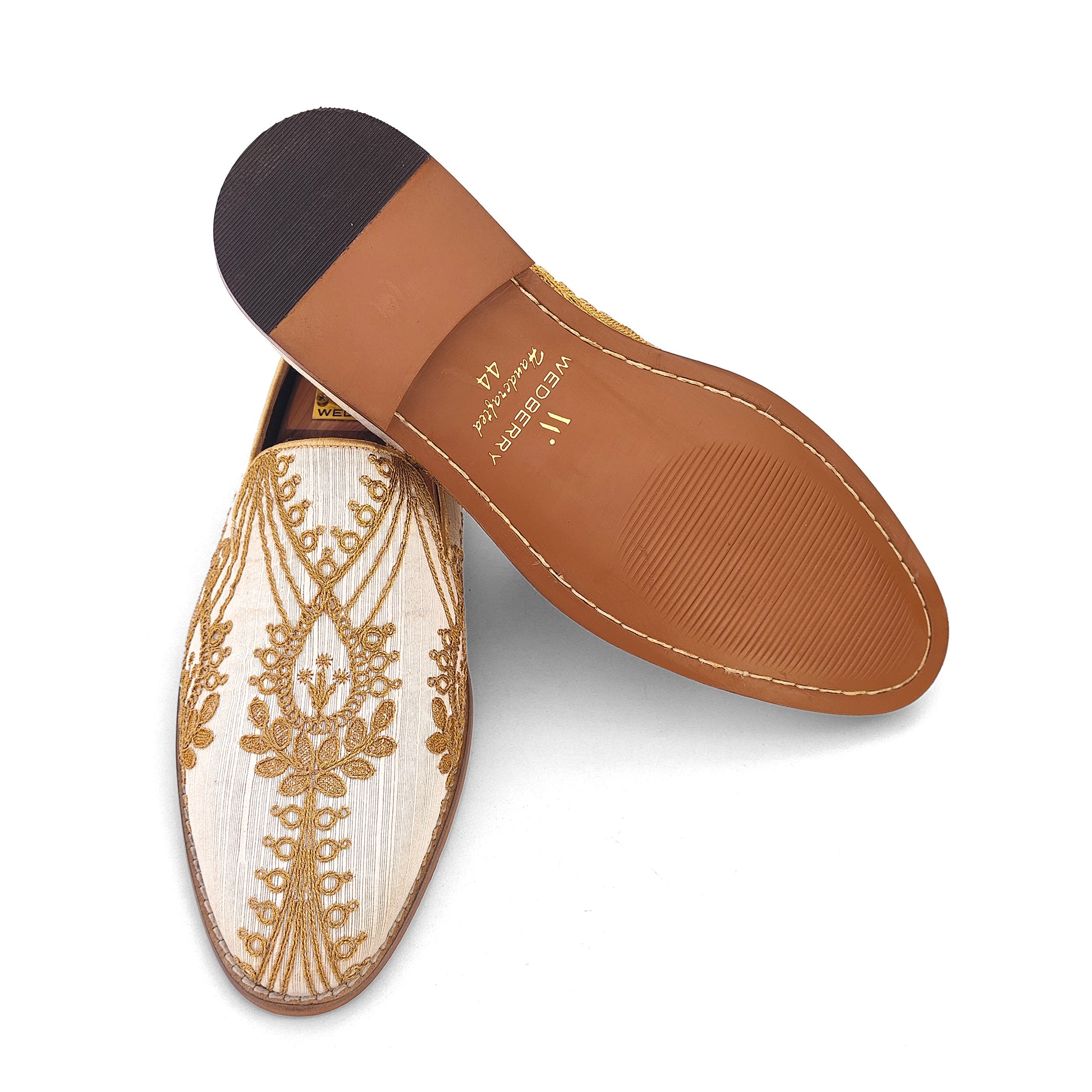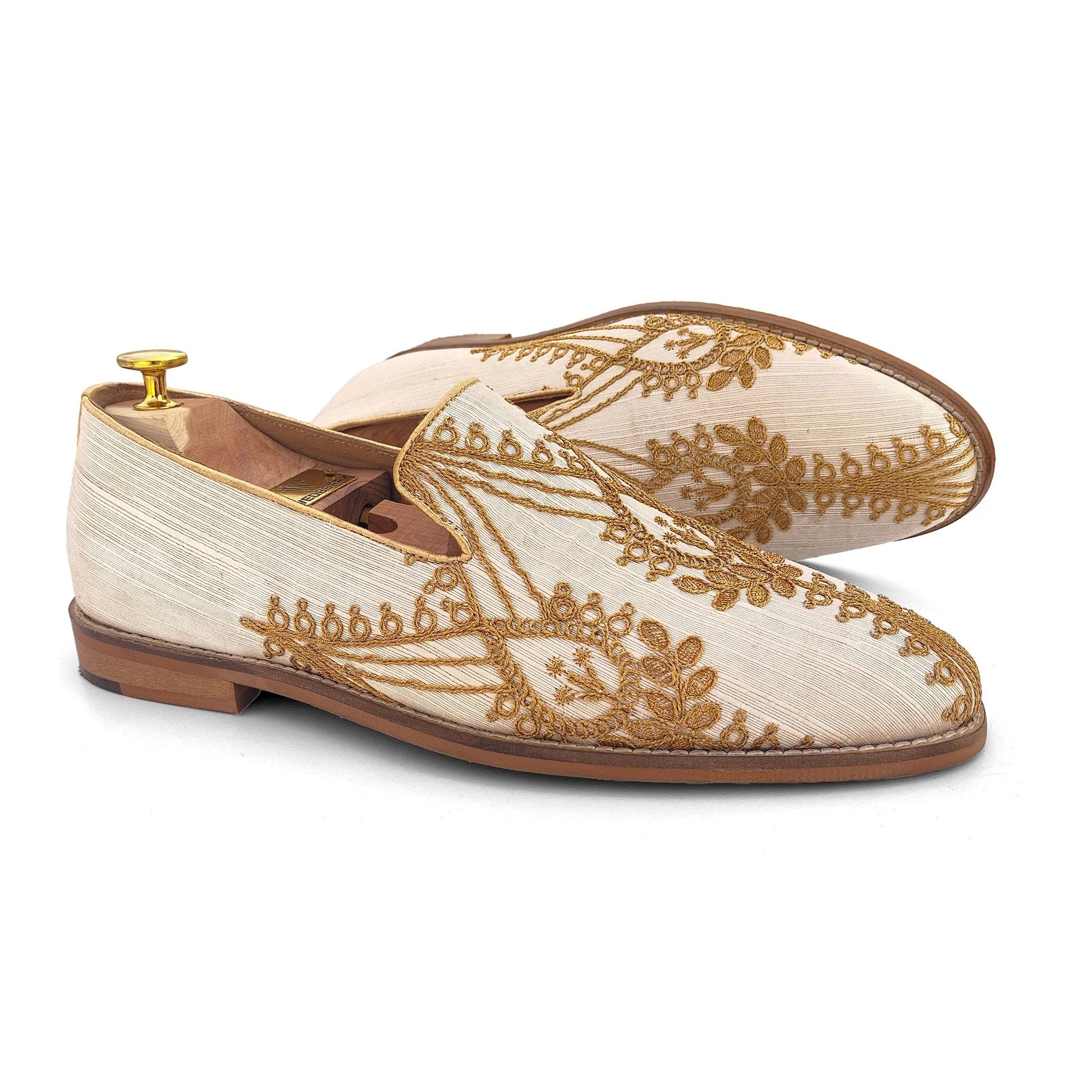 Biege with Gold Embroidery Loafer Mojari Slipon for Men