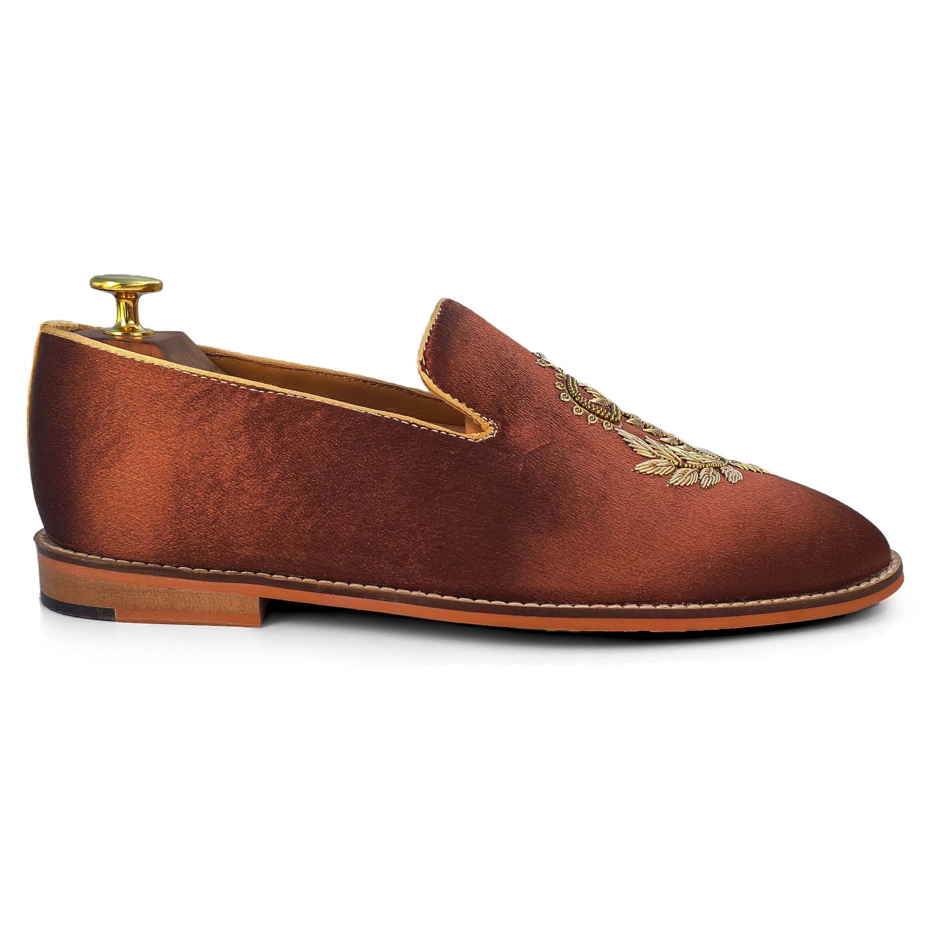 Brown Satin Silk with Golden Zardozi Handwork Loafers for Men