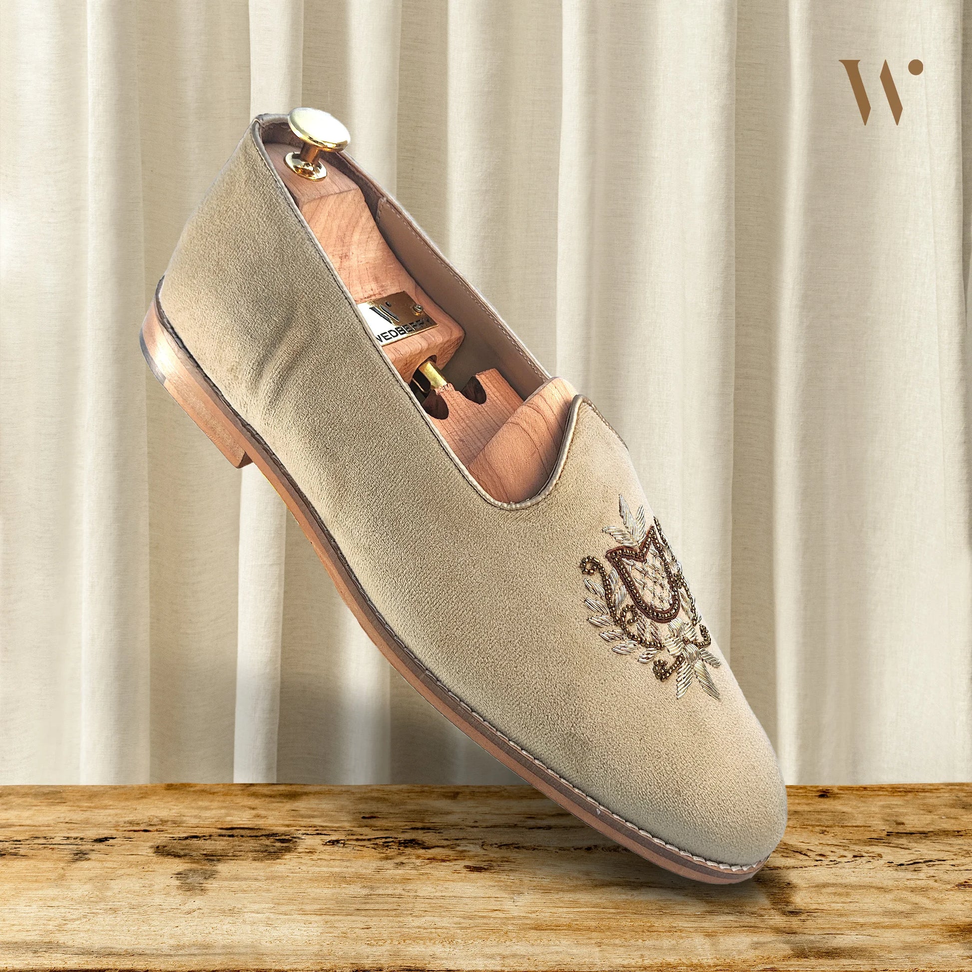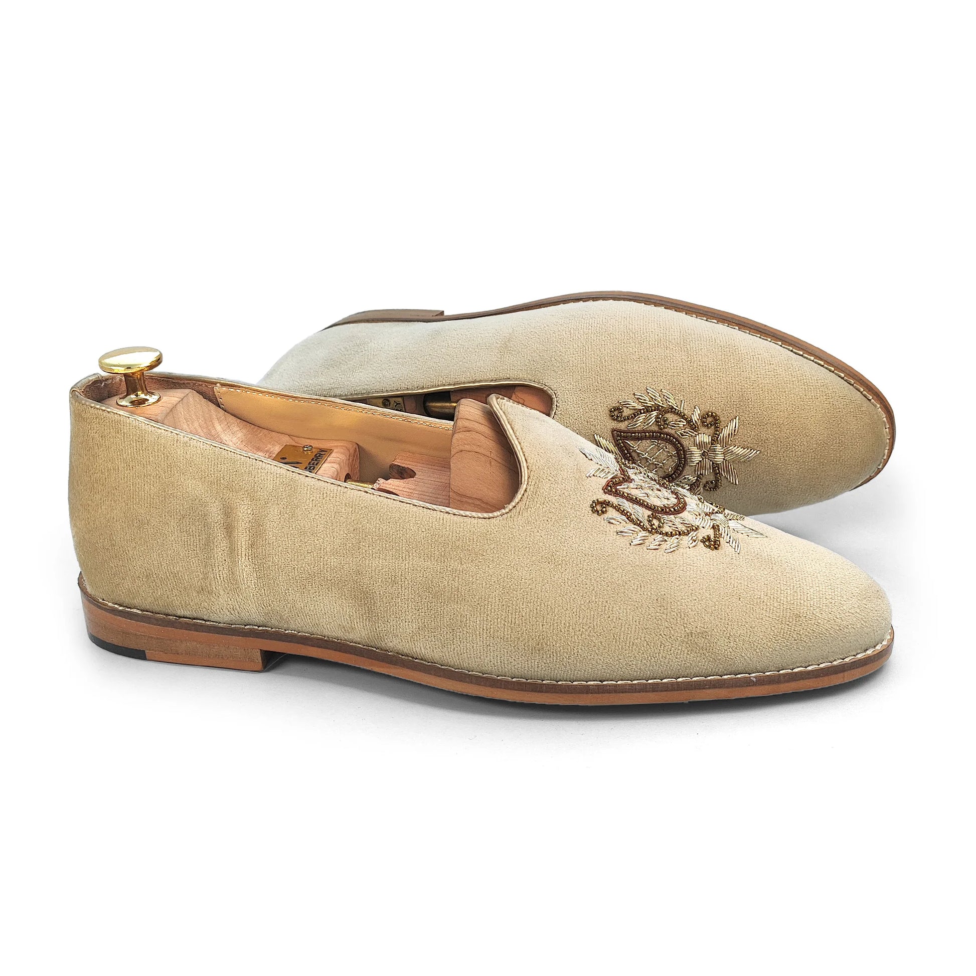 Creme Velvet Light Gold Zardozi Handwork Wedding Shoes Ethnic Mojari for Men