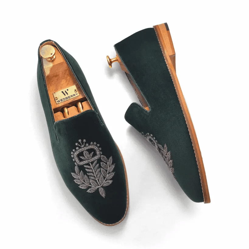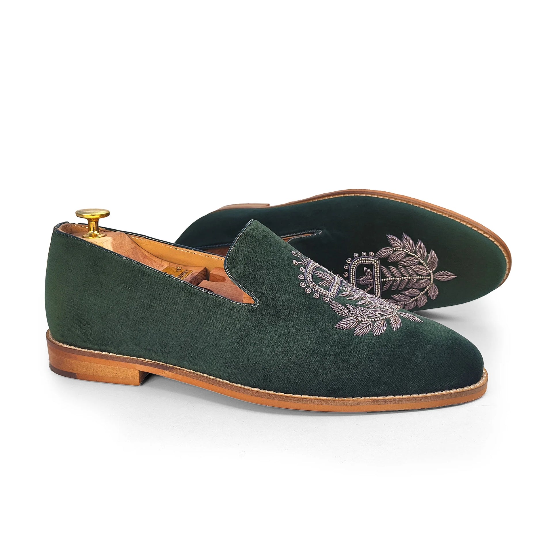 Forest Green Velvet Zardozi Wedding Ethic Shoes for Men