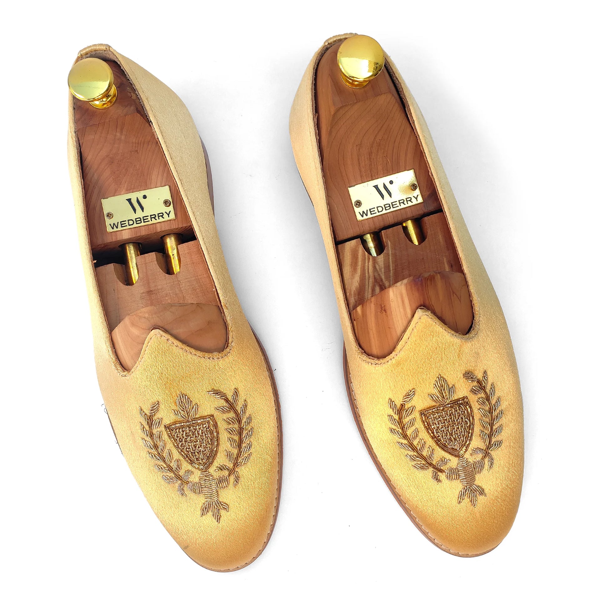 Gold Satin Zardozi Handwork Nagra Slipon Mojri for Men