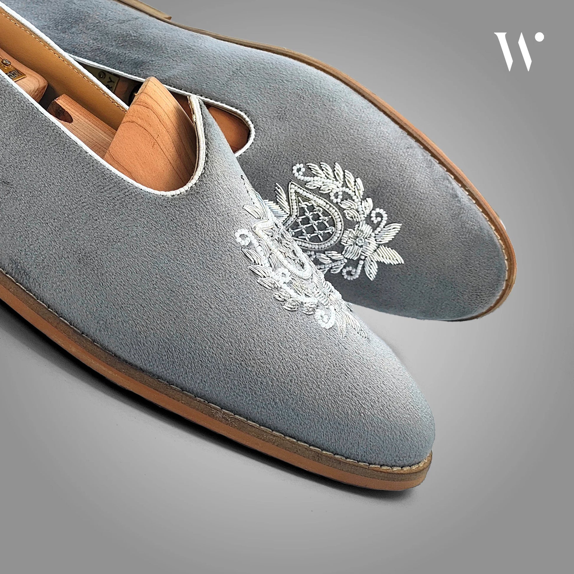Grey Velvet Silver Zardozi Handwork Wedding Shoes Ethnic Mojari for Men