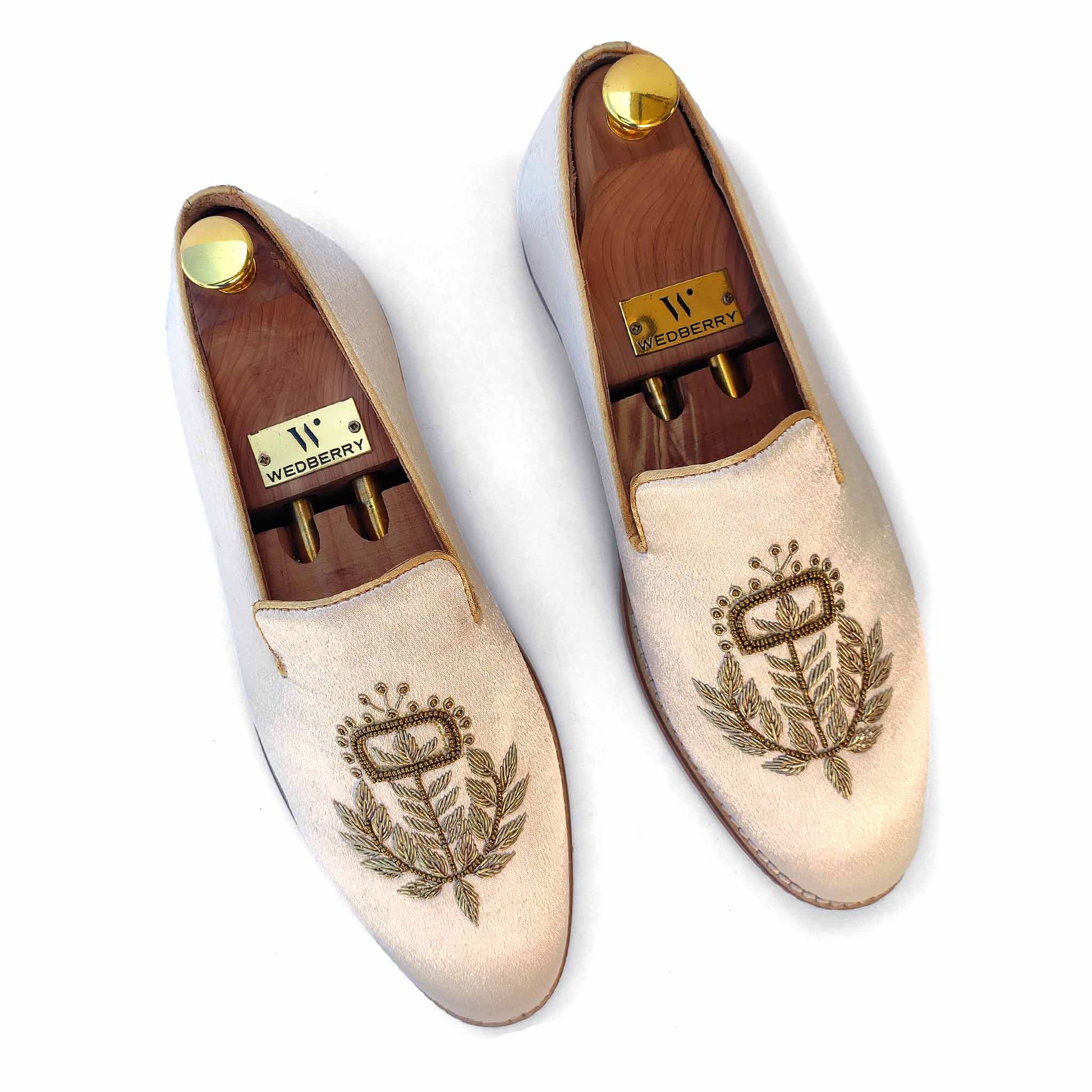 Ivory Satin Silk with Golden Zardozi Handwork Loafers for Men