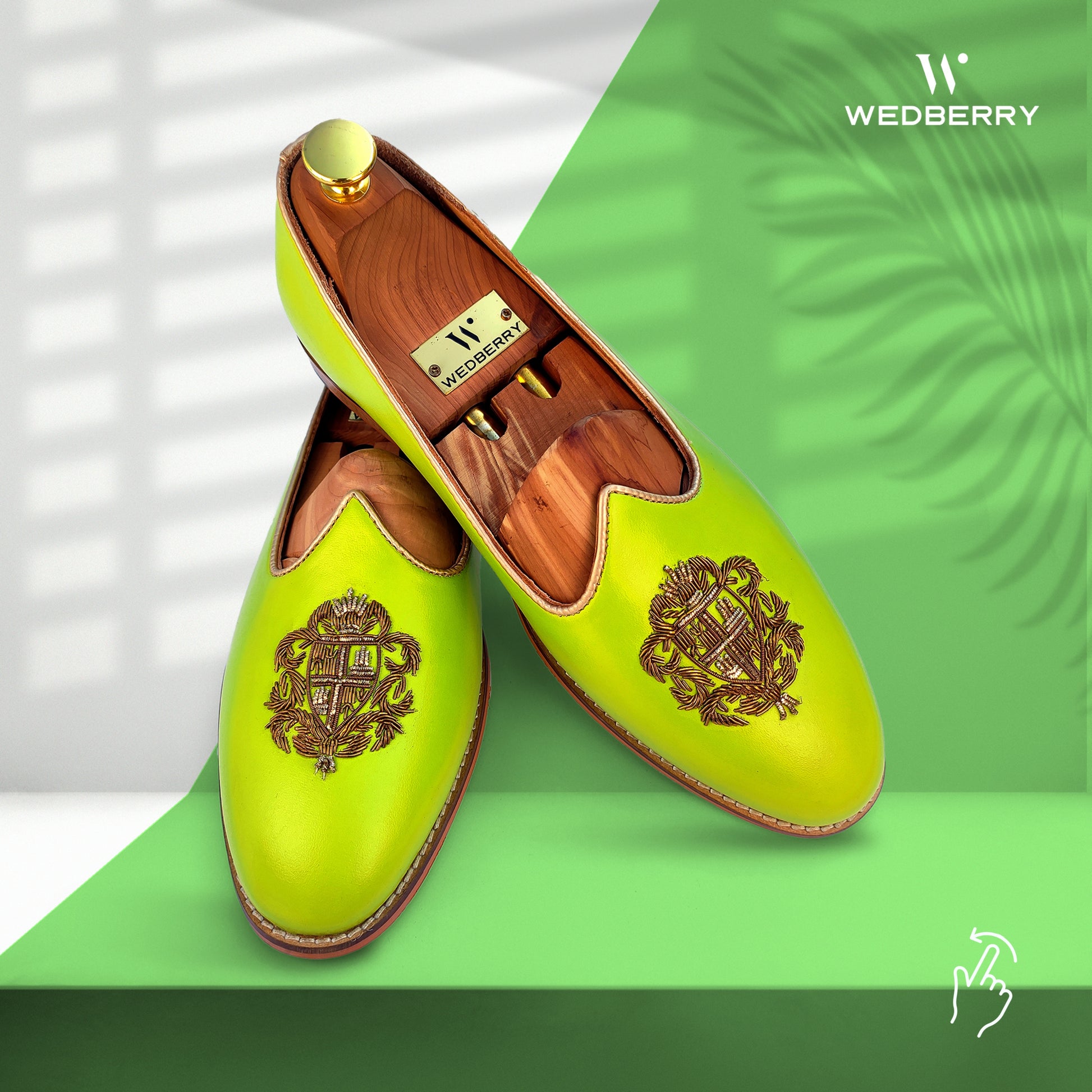 Neon Green Zardozi Handwork Wedding Ethnic Shoes Party Loafers for Men