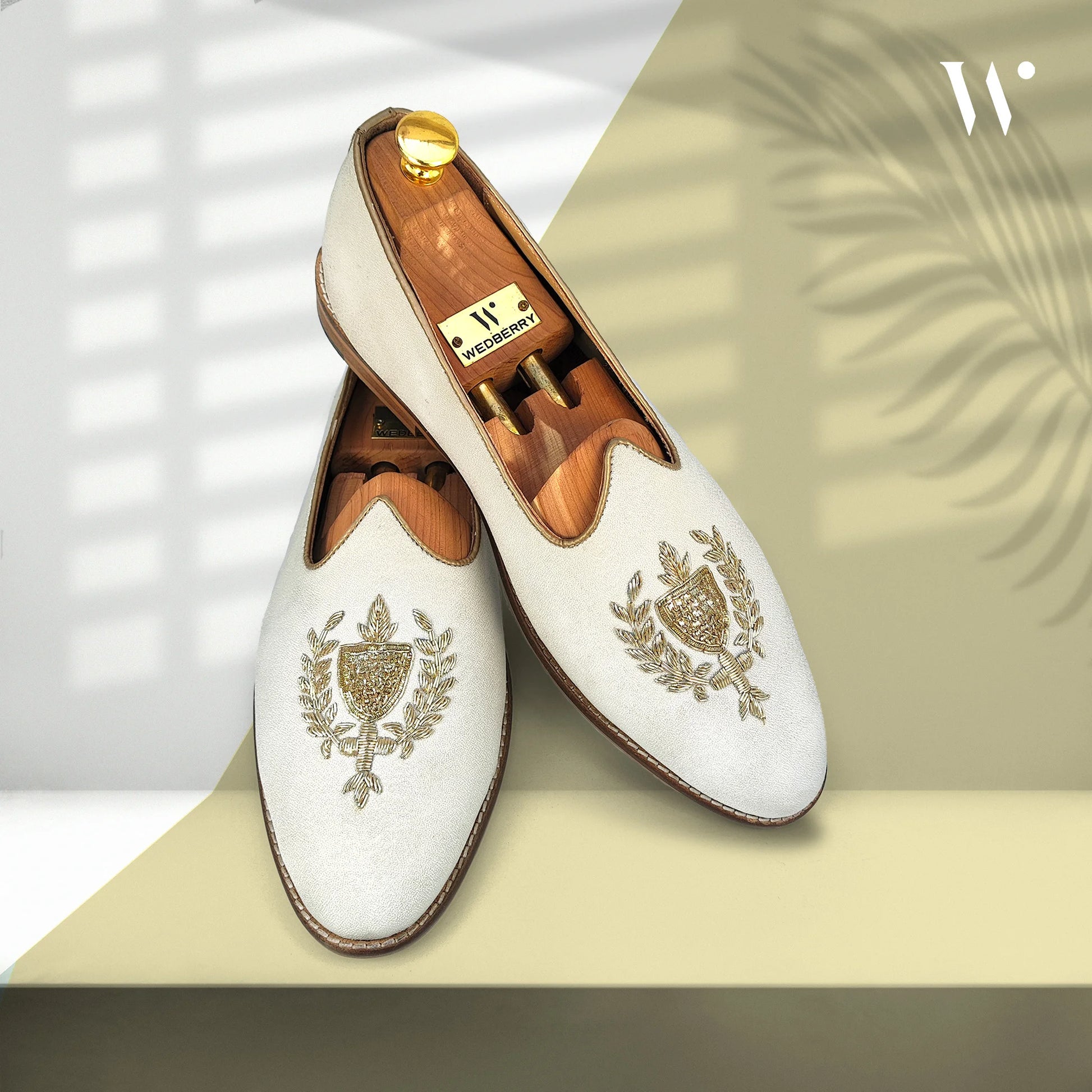 Off White Fabric Light Gold Zardozi Handwork Wedding Shoes Ethnic Mojari for Men