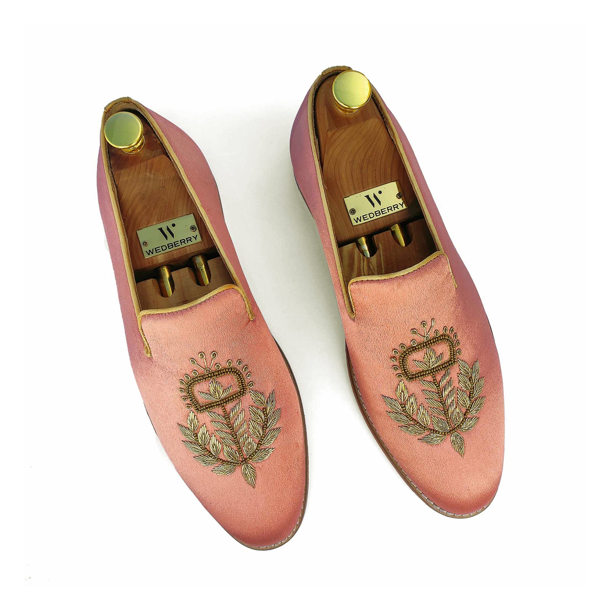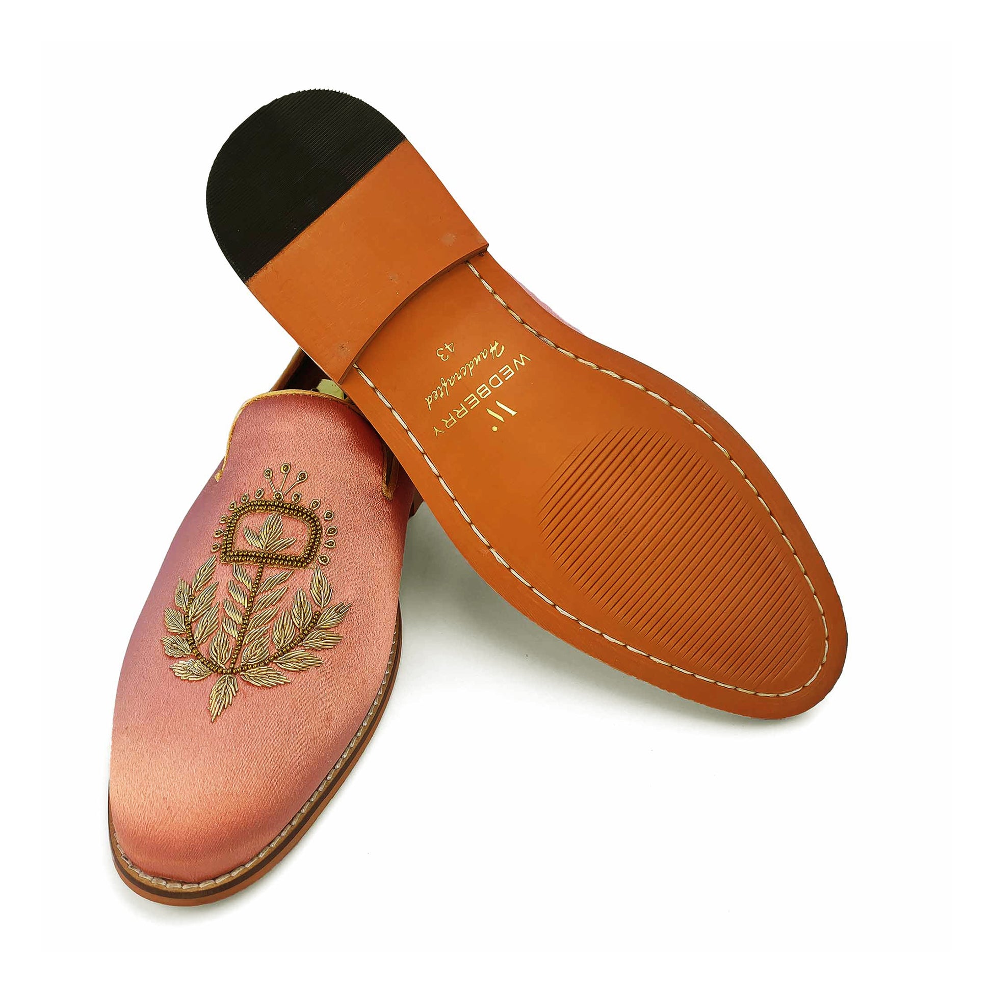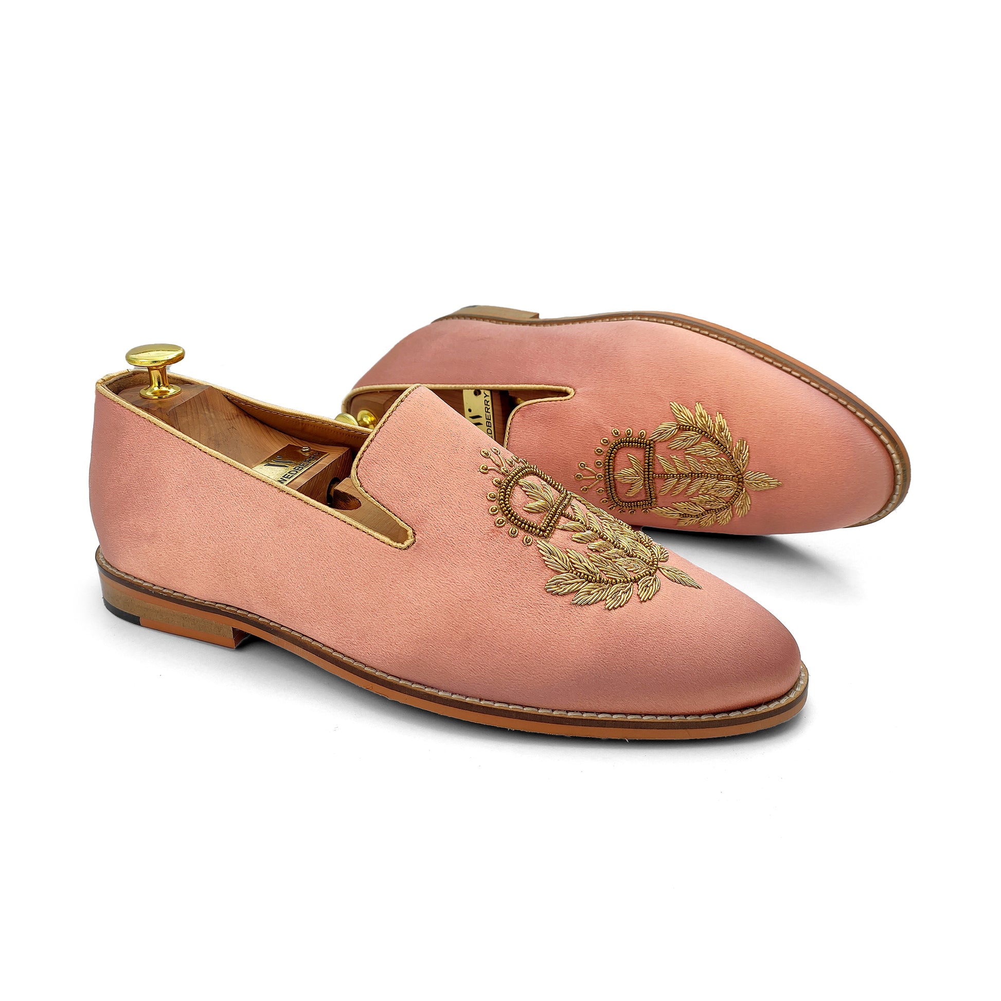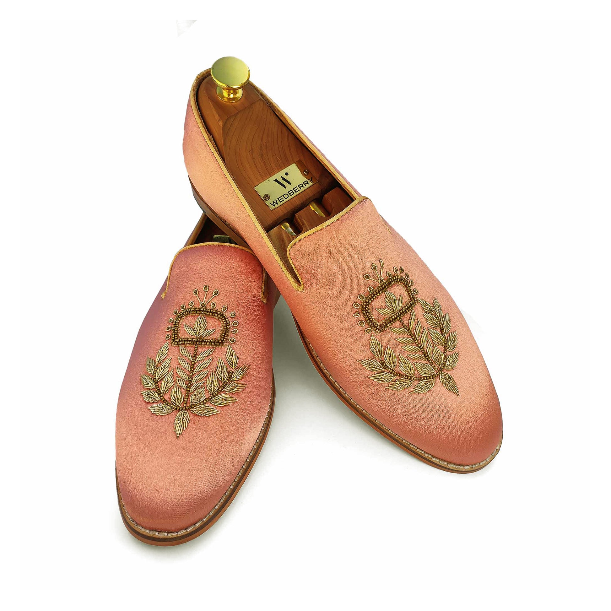 Peach Satin Silk with Golden Zardozi Handwork Loafers for Men