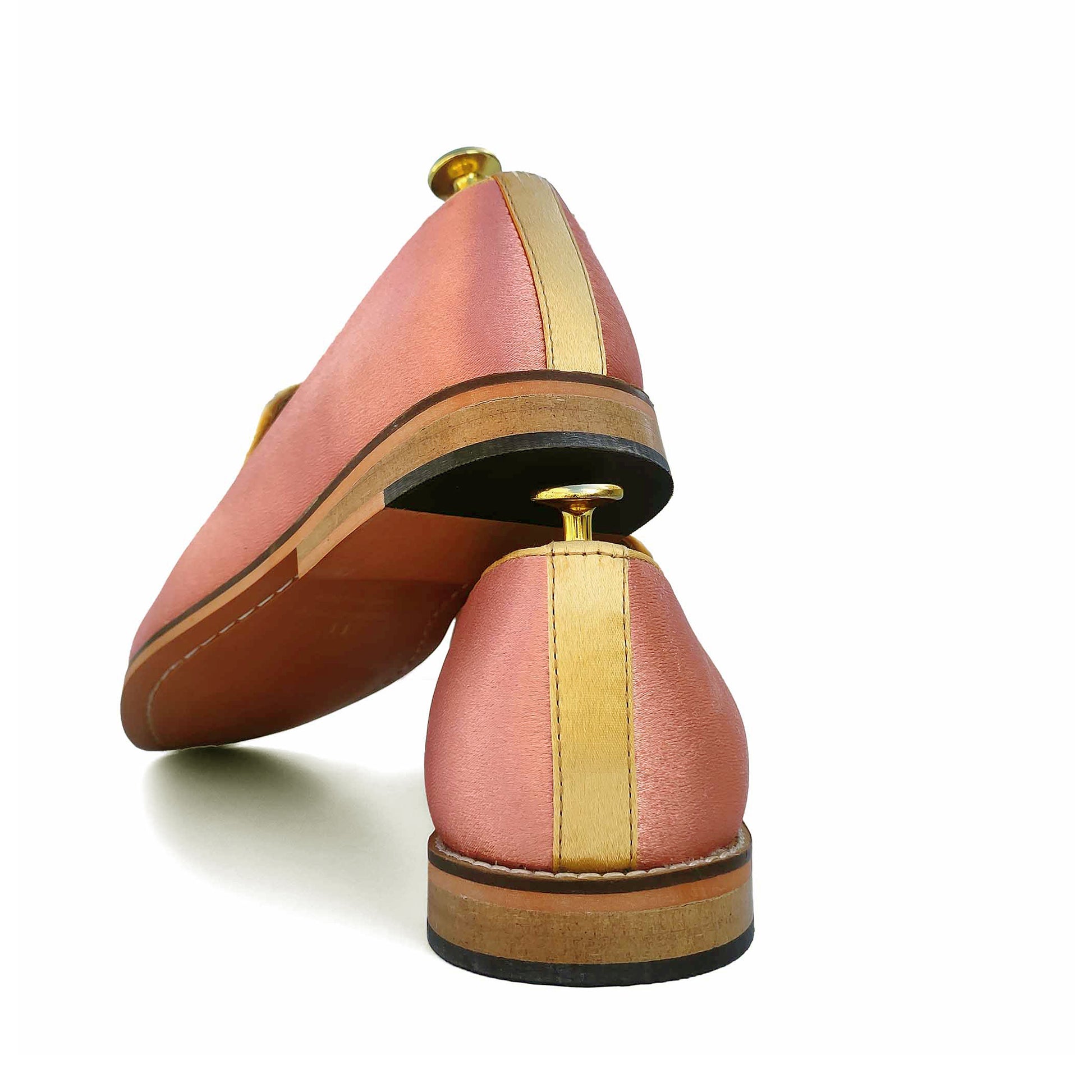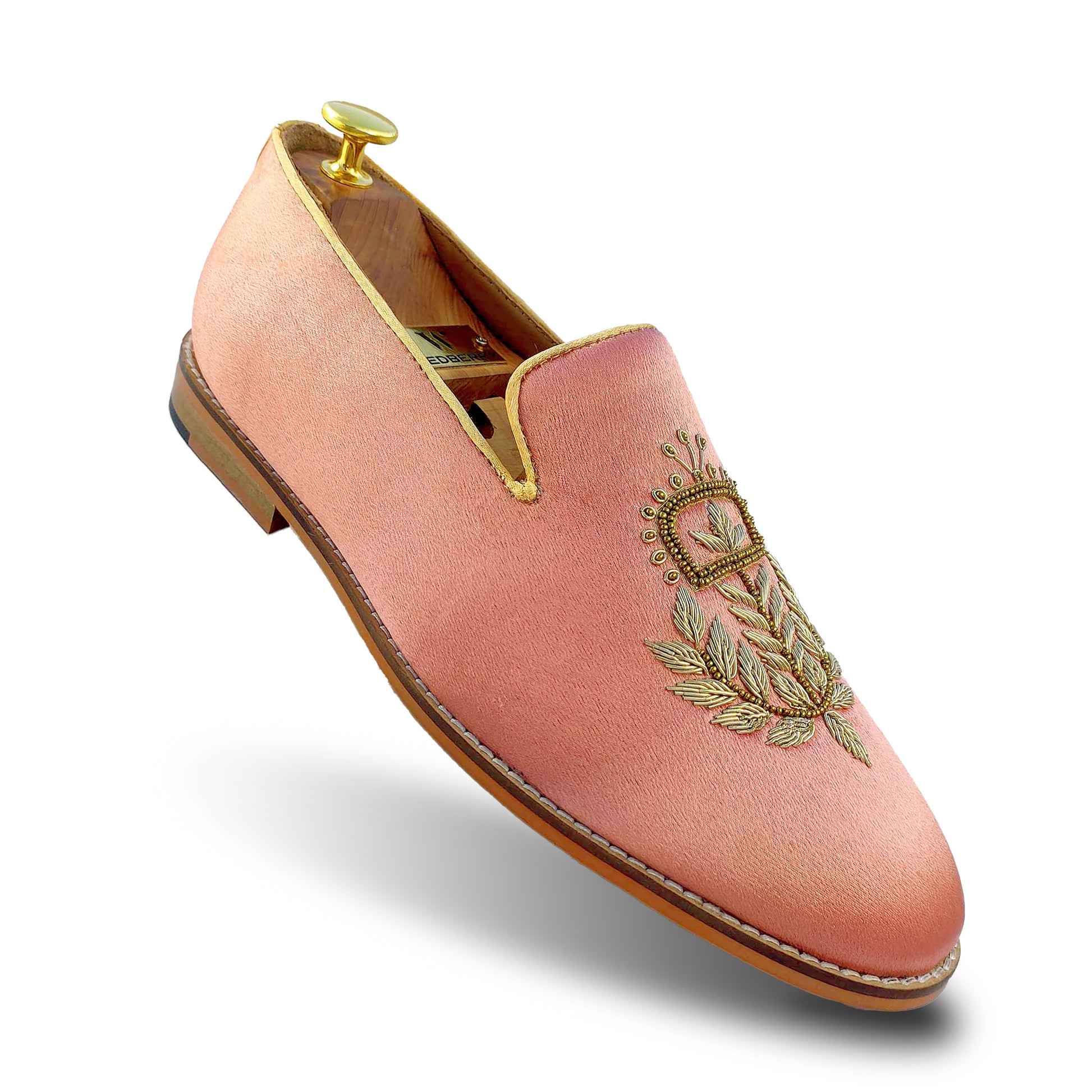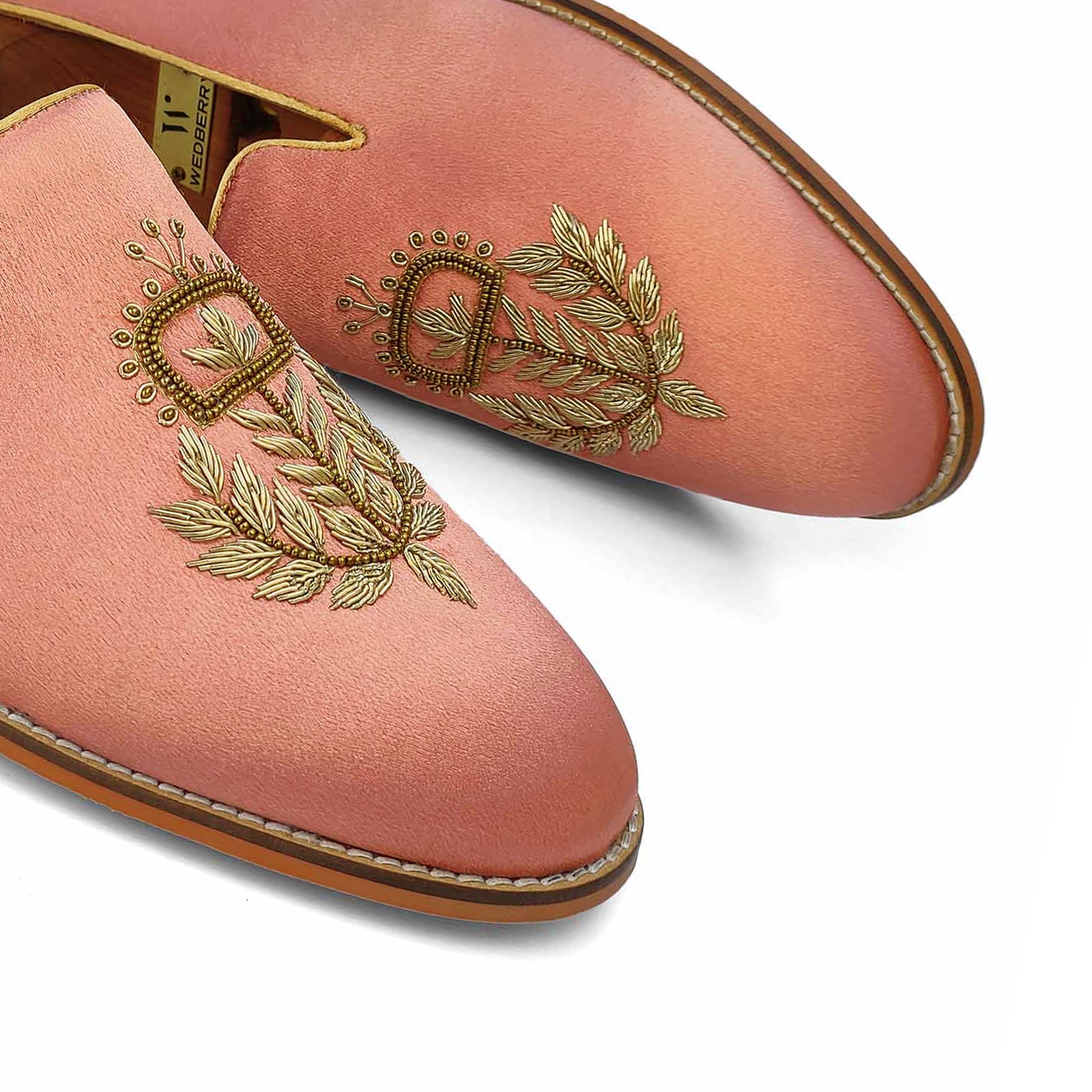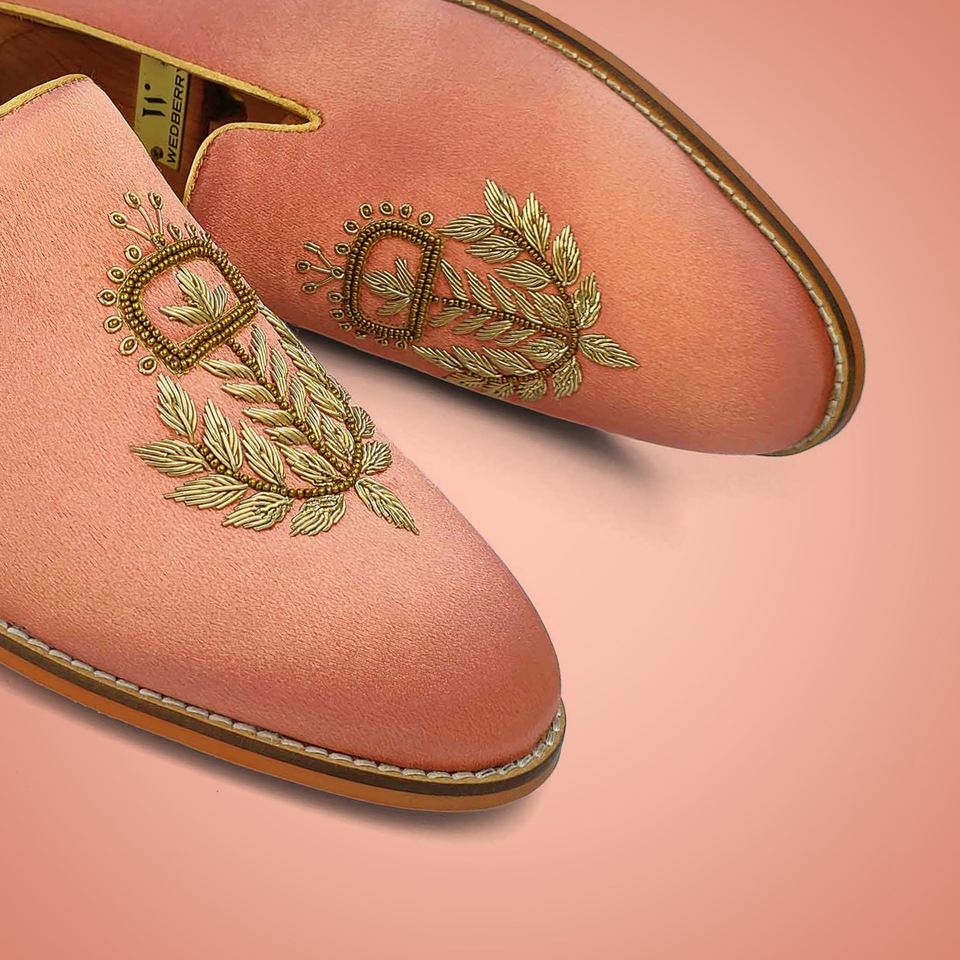 Peach Satin Silk with Golden Zardozi Handwork Loafers for Men