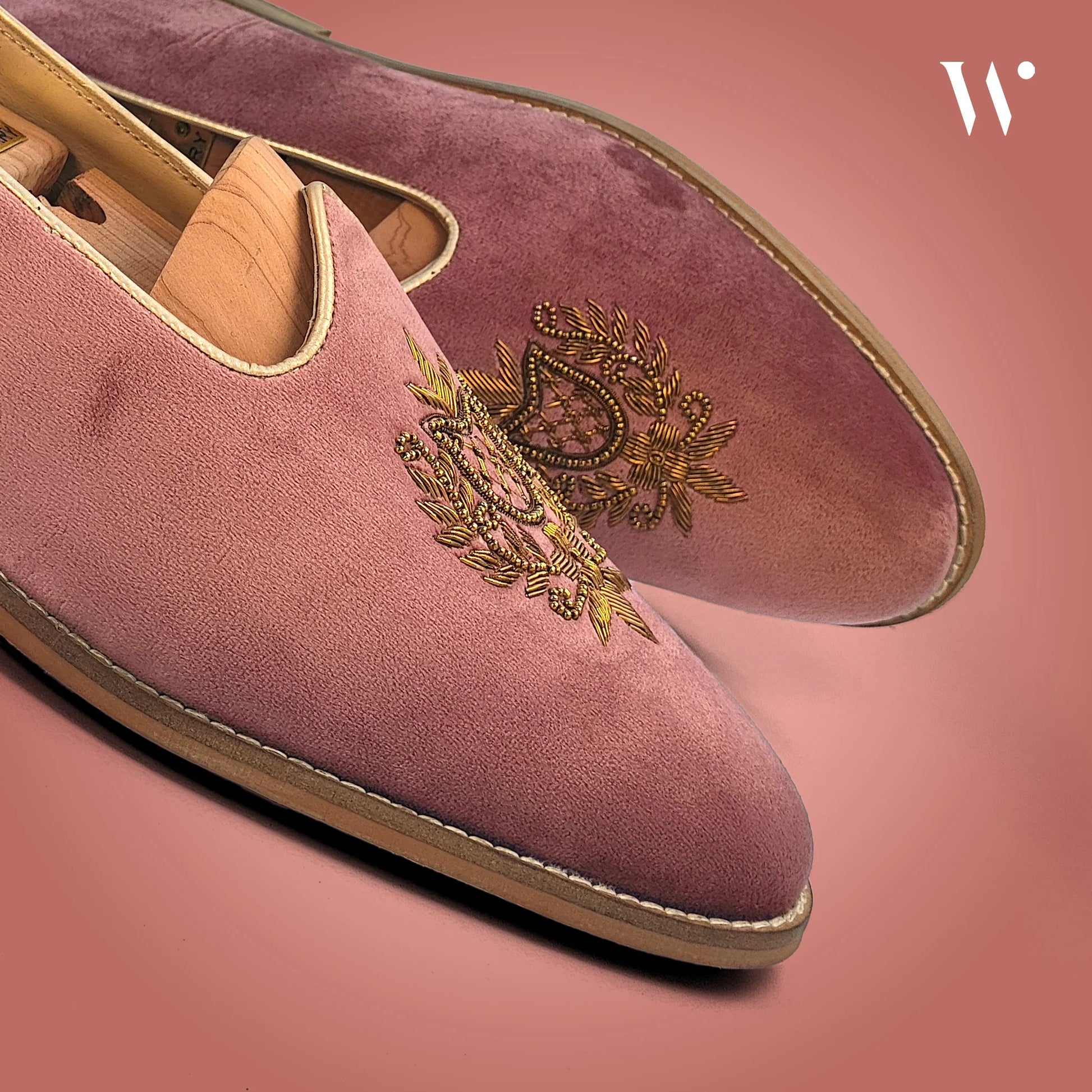 Pink Velvet Antique Gold Zardozi Handwork Wedding Shoes Ethnic Mojari for Men