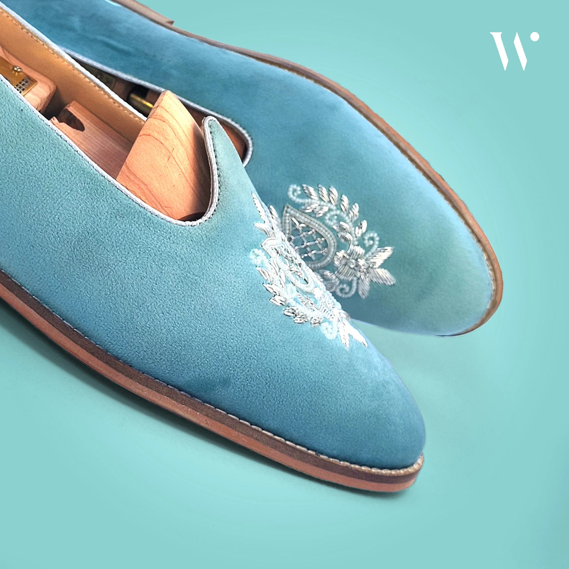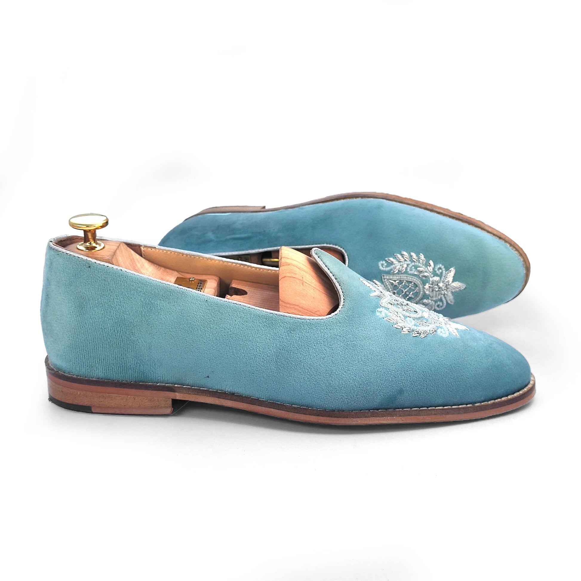 Sky Blue Velvet White Zardozi Handwork Wedding Shoes Ethnic Mojari for Men