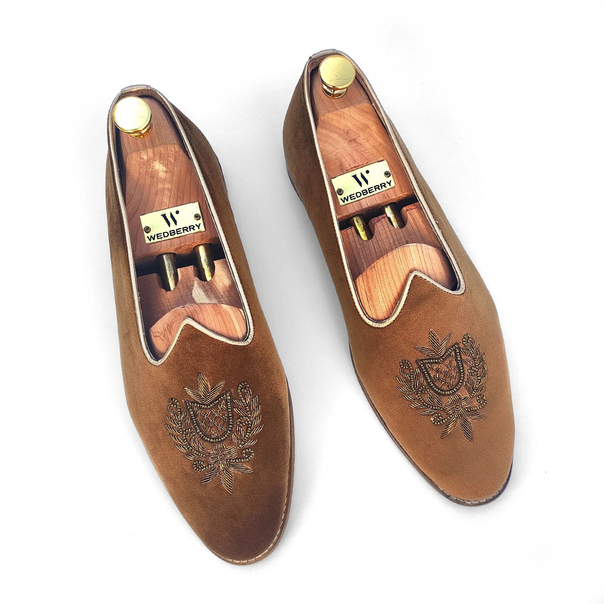 Tan Rust Velvet Antique Gold Zardozi Handwork Wedding Shoes Ethnic Mojari for Men