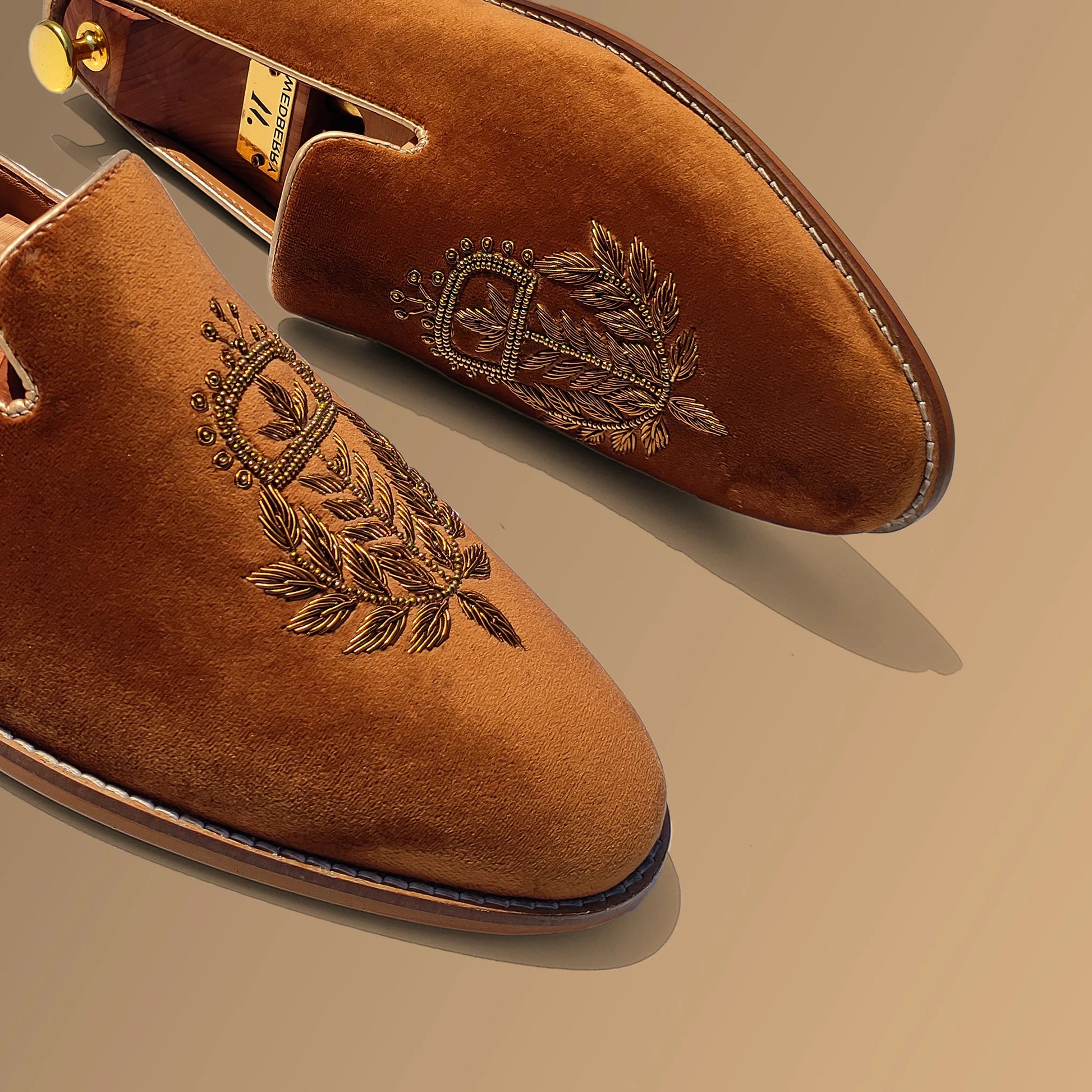 Tan Velvet Zardozi Wedding Ethnic Party Shoes Loafer for Men